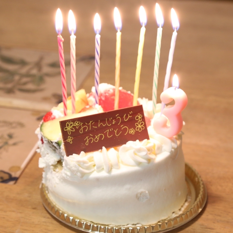 こちら、誕生日はやっぱりケーキ必要でしょ〜〜!と思って仕事帰りにチャリ走らせて揺らさないように頑張って持ち帰ったけど案の定崩れたケーキです。
